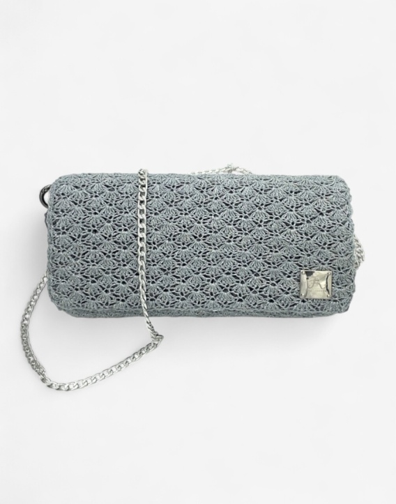Szara kopertówka szydełkowa wzbogacona srebrną metaliczną nicią, świetnie komponuje się z: