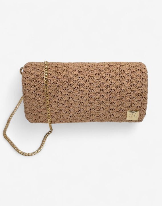 Beżowo-złota kopertówka szydełkowa świetnie komponuje się z: